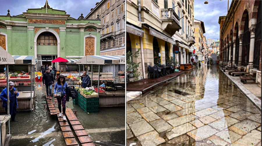 Rijeka i okolica jučer i danas su u središtu pažnje meteorologa i centara za uzbunjivanje. Opatijom je olujno jugo divljalo toliko da se odlomilo kamene ploče i ogradu na Lungomareu ispod Umjetničkog paviljona Jurja Šporera.. U Rijeci je pak palo toliko kiše da su na riječku tržnicu i ribarnicu jutros morali postaviti drvene platforme da bi se ljudi mogli kretati kroz vodu.