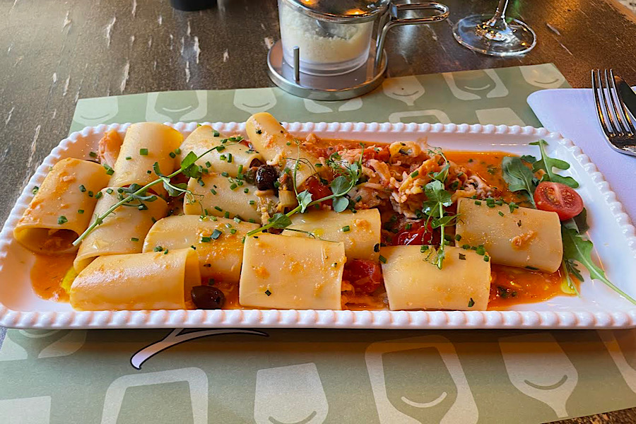 Naručili smo pacchere sa zamrznutim jastogom, najskuplje jelo na meniju, koje košta 29 eura. Paccheri su bilo odlično skuhani, školski al dente. Ali, umak od rajčica vjerojatno je napravljen bez temeljca, a sasvim sigurno bez temeljca od rakova. Budući da u studenom svježe rajčice više ne valjaju, umak je imao neugodan, vodeni okus. Potpuno je nevjerojatno da se meso jastoga ubacuje u umak koji nema nikakve veze s okusima rakova i koji nema nikakav karakter. Bilo bi logično da je Riserijina kuhinja koristila temeljac od rakova ili da je, s druge strane, jelo otišlo u smjeru jastoga Newberg. No, potrošiti jastogovo meso u bezličnom crvenom umaku dosta je ozbiljna pogreška. Ali, otkud vam ljušture za temeljac, ako kupujete zamrznuto meso rakova?
